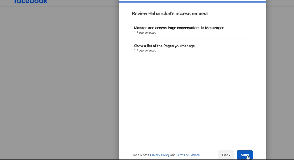 Step 4: Review the access request. This just shows the permissions and functions HabariChat is going to have access to. Click on “Save”