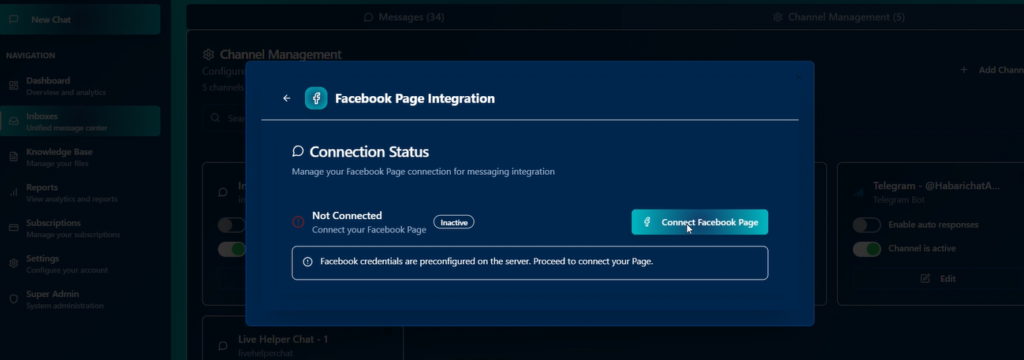 Facebook integration enables you to respond to your Facebook Page messages directly from Habarichat AI without logging into Facebook Messenger.