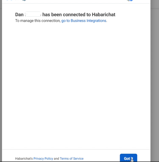 Step 10: Almost there! You will be directed to the tab that says (your name) has been connected to HabariChat, as shown below. Click on “Got it” to be redirected to the final step.