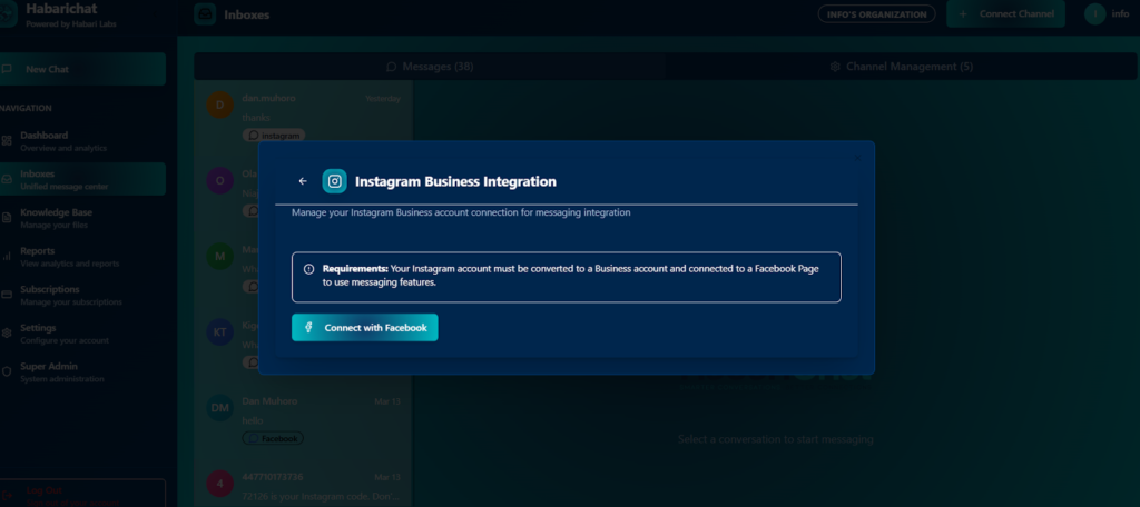 Here is a guide on how to integrate your Instagram inbox into HabariChat: